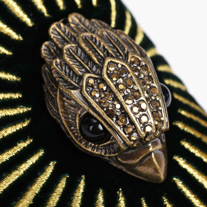 The green Ace Eagle are a velvet slip on loafer with antiqued brass Eagle head with opaque brass crystal and black bead eyes on the front vamp. There is also gold thread detailing.