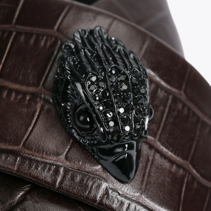 The Owen sandal is crafted from a brown, croc embossed leather. The black Eagle head features crystals and black bead eyes on the strap.